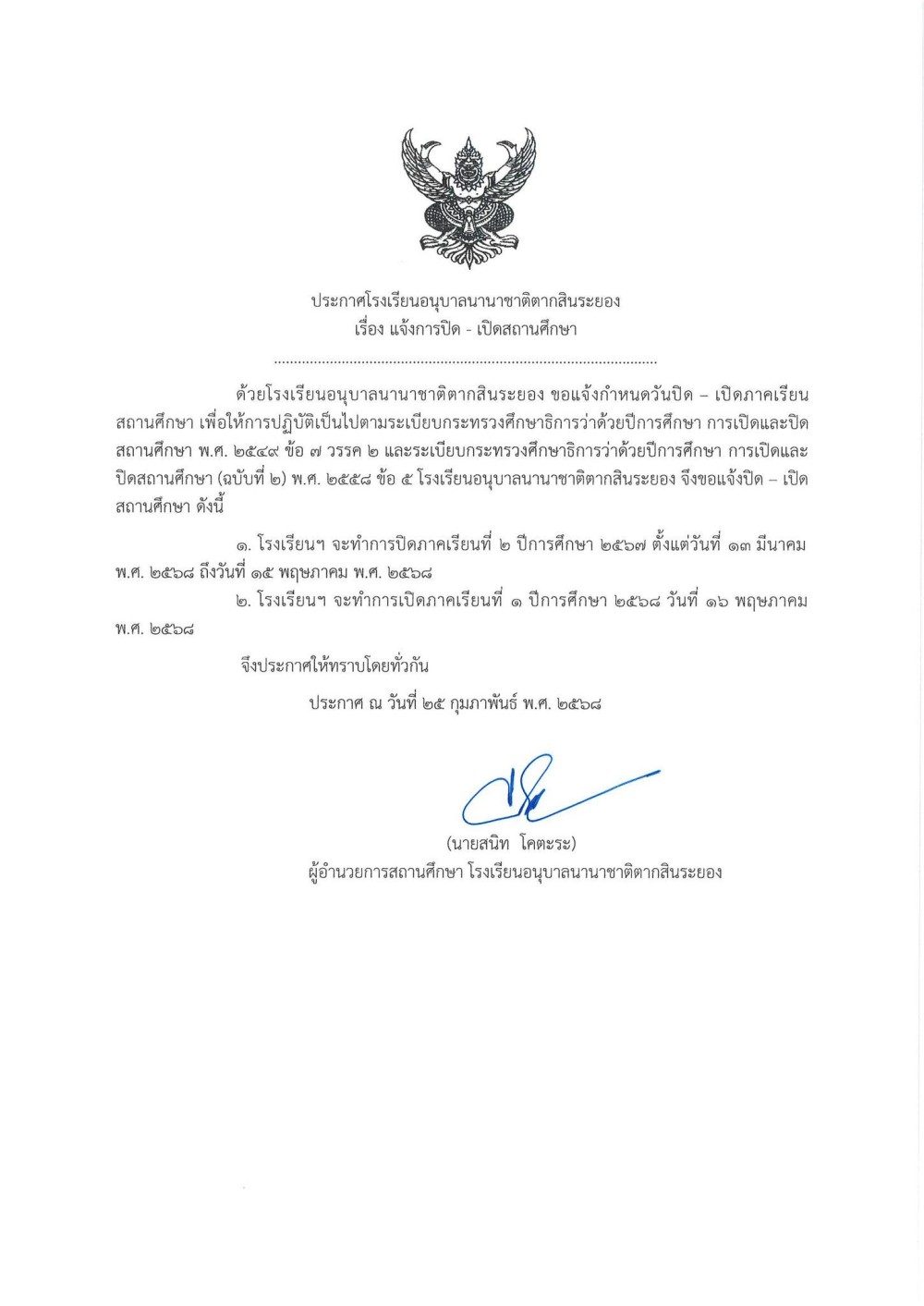 ประกาศ โรงเรียนอนุบาลนานาชาติตากสินระยอง