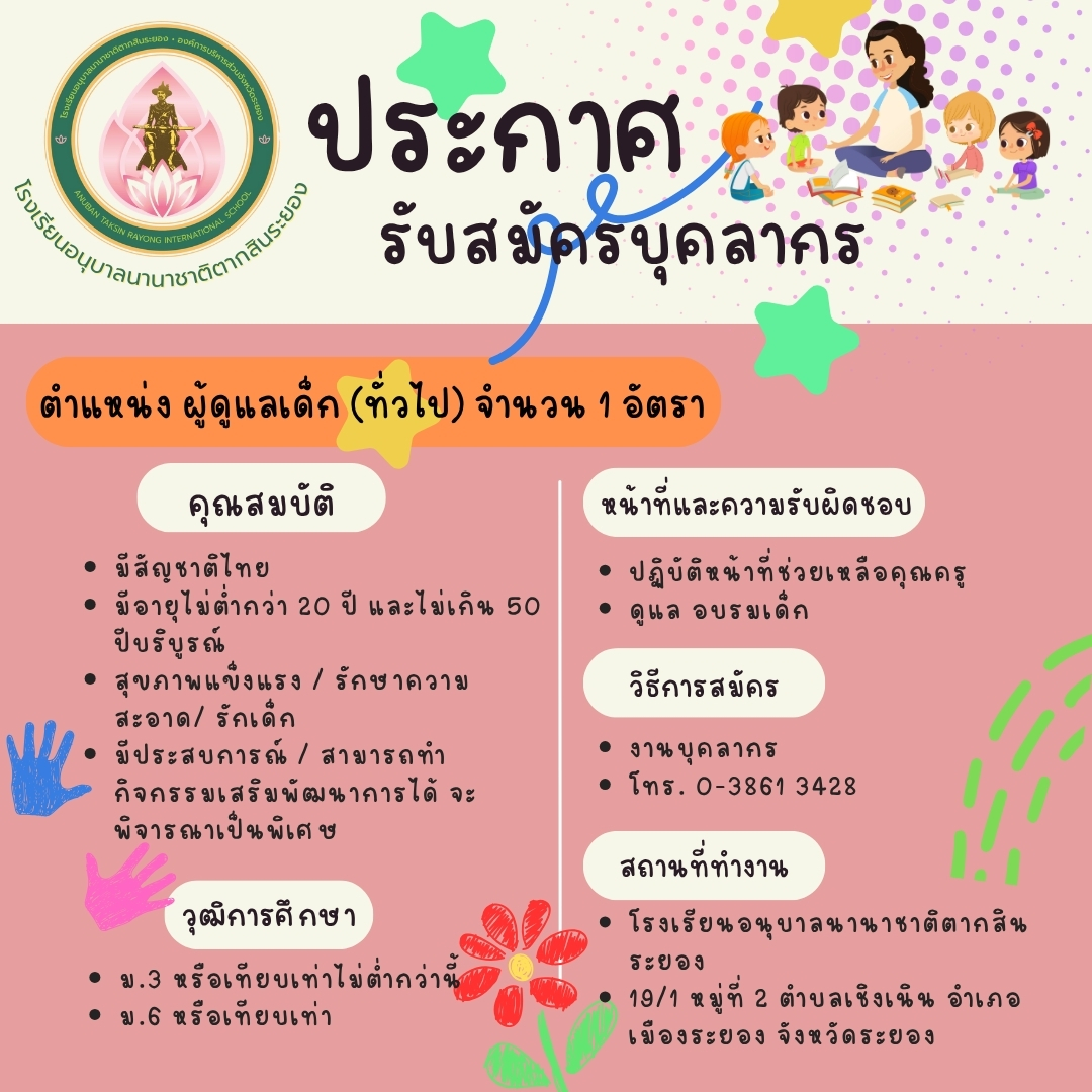 ???? ประชาสัมพันธ์ โรงเรียนอนุบาลนานาชาติตากสินระยอง????เรื่อง รับสมัครบุคลากร ???????? ตำแหน่ง ผู้ดูแลเด็ก (ทั่วไป) 1 อัตรา???? นักการ (เพศชาย) 2 อัตรา????ดาวน์โหลดใบสมัคร????https://drive.google.com/drive/folders/1UluOGLksDcIiRO8dS4AJh1FGmN0cxIJi?fbclid=IwY2xjawN2Py9leHRuA2FlbQIxMABicmlkETFRamdmd1R1ekRnZDBob0VCAR4SDvXx2JS3Wysddh9prIkvVFTzVgyfEi553OP2jj6UCIqZmiRZKQP14hdEWg_aem_PbQJuvLKQMjT3gzRSY7HLw????หรือติดต่อโทร. 0-3861 3428