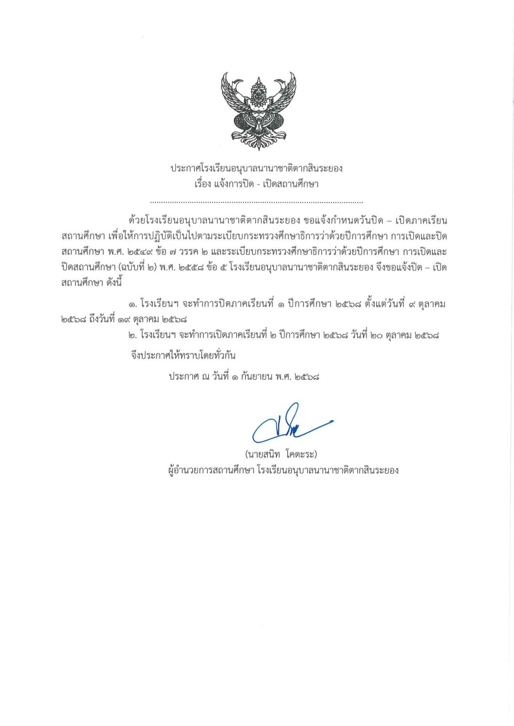 ????ประกาศโรงเรียนอนุบาลนานาชาติตากสินระยองเรื่อง แจ้งการปิด - เปิดสถานศึกษา- โรงเรียนฯ จะทำการปิดภาคเรียนที่ 1 ปีการศึกษา 2568 ตั้งแต่วันที่ 9 ตุลาคม 2568 ถึงวันที่ 19 ตุลาคม 2568- โรงเรียนฯ จะทำการเปิดภาคเรียนที่ 2 ปีการศึกษา 2568 วันที่ 20 ตุลาคม 2568