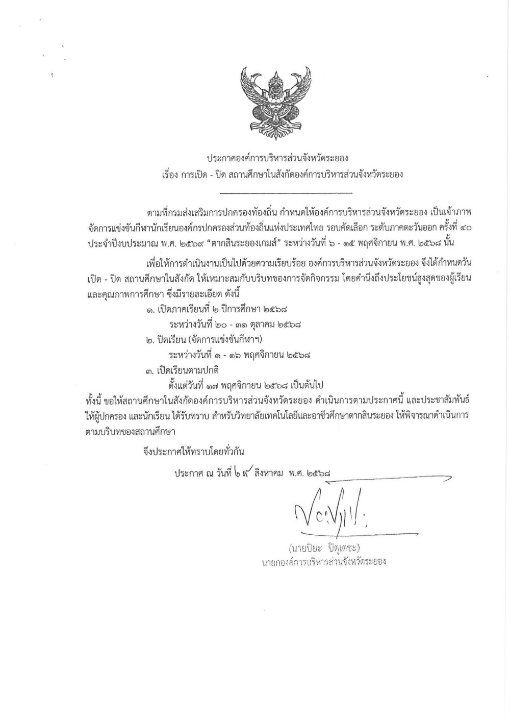 ????ประกาศโรงเรียนอนุบาลนานาชาติตากสินระยอง เรื่อง แจ้งการปิด – เปิดสถานศึกษา ในการเป็นสนามแข่งขันกีฬา ที่พักนักกีฬา และสถานที่ในการแข่งขันกีฬานักเรียนองค์กรปกครองส่วนท้องถิ่นแห่งประเทศไทย รอบคัดเลือก ระดับภาคตะวันออก ครั้งที่ 40 ประจำปีงบประมาณ พ.ศ. 2569 (ตากสินระยองเกมส์) จึงได้กำหนดวันเปิด - ปิด สถานศึกษา