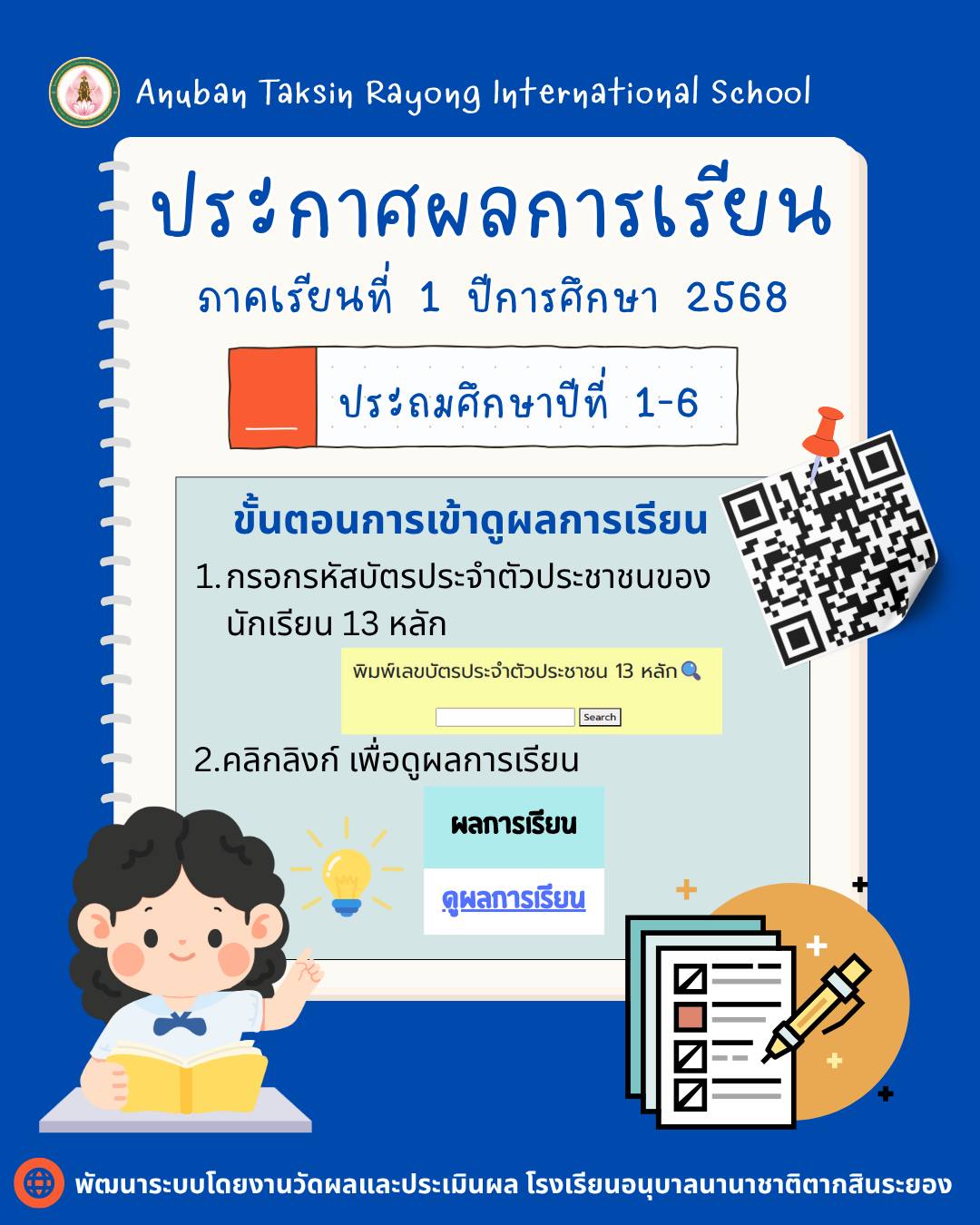 ???????? ประกาศผลการเรียน ภาคเรียนที่ 1 ปีการศึกษา 2568 ???????????? สำหรับนักเรียนระดับชั้นประถมศึกษาปีที่ 1 – ประถมศึกษาปีที่ 6???? ผู้ปกครองสามารถได้ที่ลิงก์ด้านล่างนี้???? urlkub.co/HM3eYr???? โดยมีวิธีการเข้าดูผลการเรียน1️⃣ กรอก เลขประจำตัวประชาชนนักเรียน 13 หลัก โดย ไม่ต้องเว้นวรรค2️⃣ ???? กรณีนักเรียนต่างชาติให้กรอกเลข “1” แทนตัวอักษรภาษาอังกฤษ???? ตัวอย่างหากเลขประจำตัวประชาชนคือ G-662100010748ให้กรอกเป็น 1662100010748 (ใส่เฉพาะตัวเลขเท่านั้น)???? หากบัตรไม่ครบ 13 หลัก ให้เพิ่มเลข “1” ด้านหน้าจนครบหลัก???? กรณีนักเรียนที่ขาดสอบ (ไม่มีผลสอบ)โปรดมาสอบในวันที่ 20 ตุลาคม 2568 เป็นต้นไป???? และจะประกาศผลสอบในวันที่ 31 ตุลาคม 2568???? กรณีค้างชำระค่าเทอมหากผู้ปกครองมาชำระค่าเทอมหลังจากวันที่ 10 ตุลาคม 2568ฝ่ายวัดผลและประเมินผลจะดำเนินการ อัปเดตผลการเรียนในระบบภายหลัง????️ กำหนดการแจ้งผลการเรียนเพิ่มเติม• ทุกวันที่ 1 และ 16 ของเดือน โดยทั้งนี้จะเริ่มตั้งแต่วันที่ 31 ตุลาคม 2568 เป็นต้นไป???? ขอแสดงความยินดีกับนักเรียนทุกคนและขอขอบคุณผู้ปกครองทุกท่านที่ให้ความร่วมมือค่ะ ????????????ฝ่ายวัดผลและประเมินผลโรงเรียนอนุบาลนานาชาติตากสินระยอง