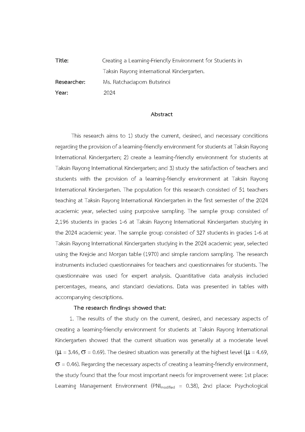 ชื่อเรื่อง : การจัดสภาพแวดล้อมที่เอื้อต่อการเรียนรู้ของนักเรียนโรงเรียนอนุบาลนานาชาติ ตากสินระยองผู้วิจัย : นางรัชฎาภรณ์ บุตรศรีน้อยปีที่วิจัย : 2567
