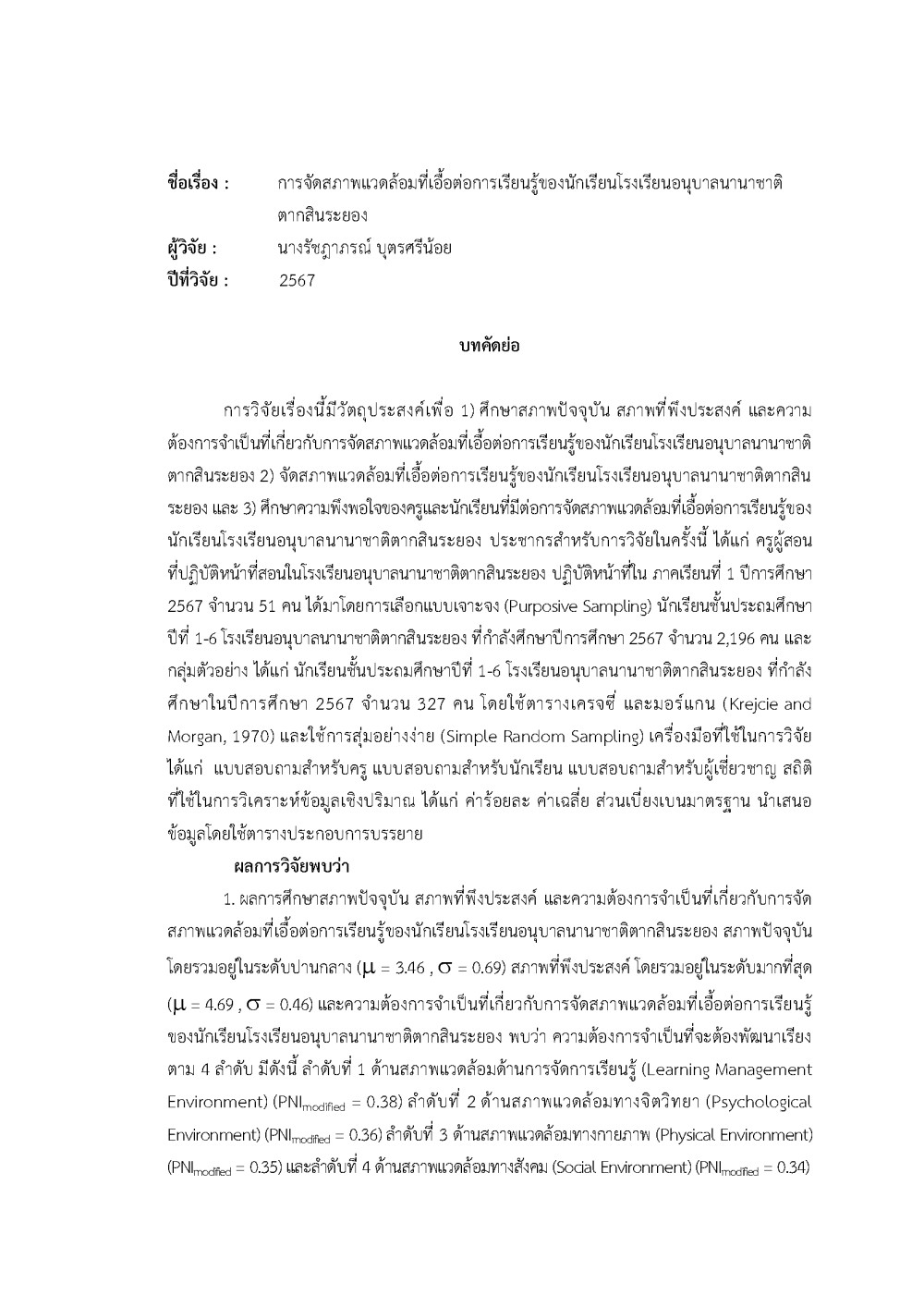 ชื่อเรื่อง : การจัดสภาพแวดล้อมที่เอื้อต่อการเรียนรู้ของนักเรียนโรงเรียนอนุบาลนานาชาติ ตากสินระยองผู้วิจัย : นางรัชฎาภรณ์ บุตรศรีน้อยปีที่วิจัย : 2567